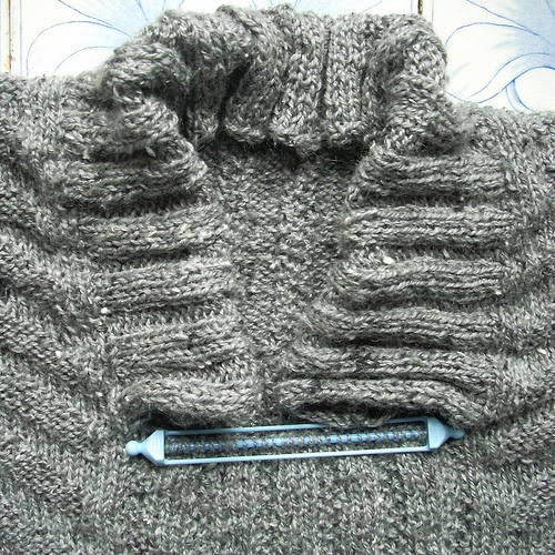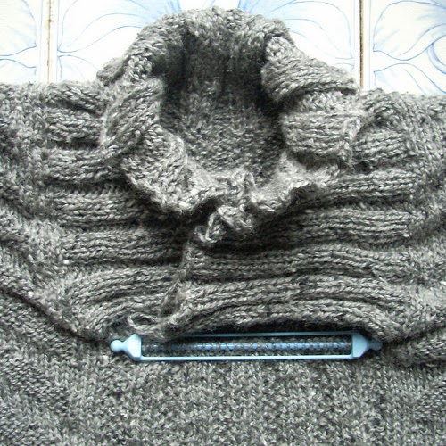 I didn't want to pick up stitches to knit the sleeves in case I'd decide to rip and reknit the front, and that's where I left it. Well, it's funny how a simple solutiona can take more than a year: I'll fold it in half instead. No overlapping, but it looks fine and the opening is big enough - and there will be no ripping or reknitting.