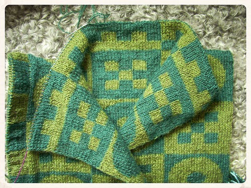 Also, I've made up my mind about the collar for my double-knitted jacket/cardigan. I've tried various ideas: I wanted something different from the main pattern and tried both triangles and stripes but wasn't satisfied. Then I suddenly thought I'd keep the small squares but use them into lego-like brick shapes. Of all the things I love about knitting, I think I like solving difficulties best.
